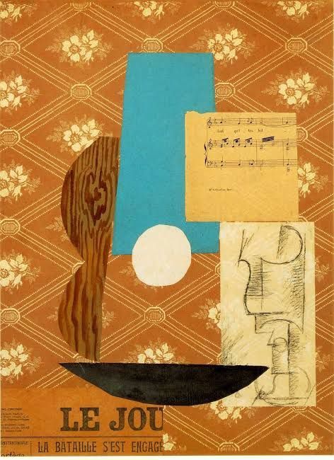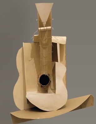 Here I have highlighted a few examples below, starting with a collage of mixed materials (first image, below) which Picasso developed into a form of Synthetic Cubism which further mixed traditional painting with collage and additional material (see second image, below). Finally, I have demonstrated Picasso’s attempts to define the essence and perception of the guitar in sculpture, using cardboard, paper, string & wire (third image, below).